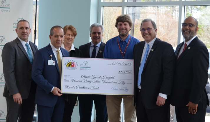 Caption: Maryland Broadband Cooperative presents a USAC reimbursement check for $193,050 to Atlantic General Hospital as part of a federal program to ...