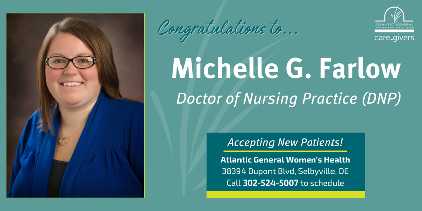 In December, Atlantic General Women’s Health provider Michelle G. Farlow earned a Doctor of Nursing Practice (DNP) degree - the highest level of ...